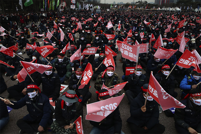 ▲写真 労働条件改善を要求する集会を開く韓国労働組合連盟のメンバー(2022年1月15日、韓国・ソウル) 出典:Photo by Chung Sung-Jun/Getty Images