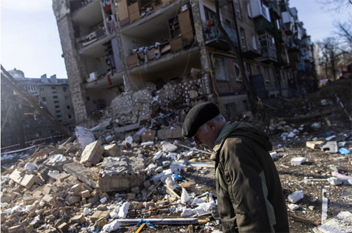 ▲写真 ロシアの攻撃によって甚大な被害を受けた住宅団地(2022年3月18日 ウクライナ・キエフ) 出典:Photo by Chris McGrath/Getty Images