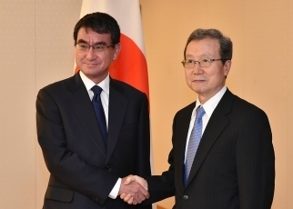 写真)河野太郎外相を表敬訪問した程永華大使(2017年9月25日 外務省) 出典)外務省ホームページ