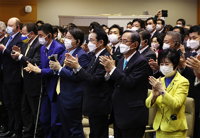 ▲写真 ゼレンスキー・ウクライナ大統領の演説後拍手する岸田総理。右手前が山東昭子参院議長。 出典:首相官邸