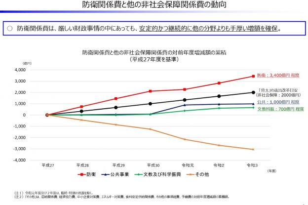 と、指摘している。平成27年度を基準にすれば防衛費の増額は約3400億円であり、「骨太」の歳出改革目安(非社会保障:2000億円)、公共事業約1,000億円、文教及び科学振興費約700億円と比べ、防衛費の伸びは3千億円と大きい。その他の費用が約3千億円マイナスで、それを全部防衛につぎ込んでいるような形となっている。つまり、今の状態ですら防衛費は長期的に相当優遇されているということだ。