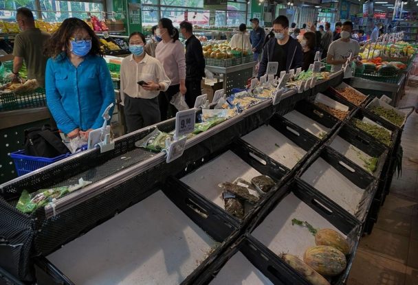 写真)野菜などが買い占められ棚から消えたマーケット(2022年4月25日 中国・北京市)