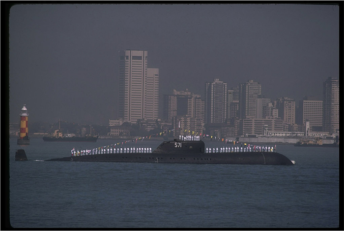 ▲写真 インド海軍が保有するソビエト製原子力潜水艦チャクラ(1989年2月15日 ) 出典:Photo by Robert Nickelsberg/Getty Images