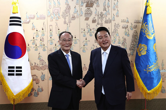 ▲写真 尹錫悦韓国大統領と王岐山中国国家副主席(2022年5月10日、韓国・ソウル) 出典:Photo by Chung Sung-Jun/Getty Images
