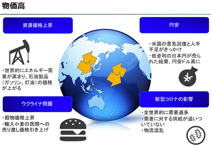・物価高は資源価格の上昇、円安、ウクライナ問題、新型コロナの影響が複雑に絡んで起きた問題。