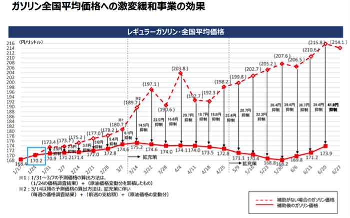 まずは、燃料油に対する激変緩和事業(経済産業省、国土交通省)として、ガソリンなど燃油価格を抑えるために石油元売り会社に支給している補助金の上限を1リットル当たり25円から35円に引き上げること、その実施期間を当面9月末まで継続することなどが含まれている。