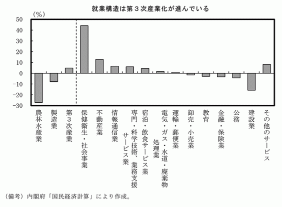 内閣府の2005~15年度の職種別の就業者数の変化率では、製造業では就業者減少、サービス業では増加、なかでも、医療、不動産、情報通信等で就業者数が増加した。