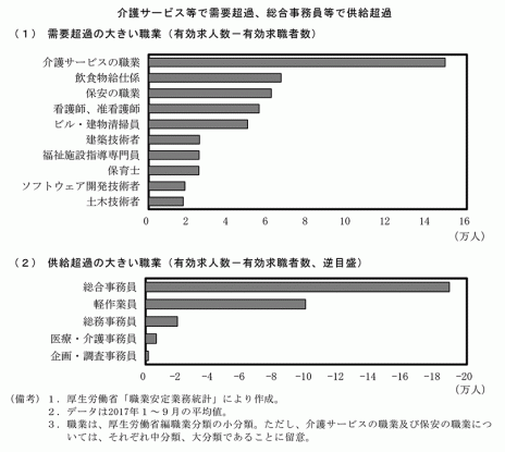 職業で見ると、一般事務員、軽作業員が求職超過、つまり仕事を求める人が求人数より多い状況である。