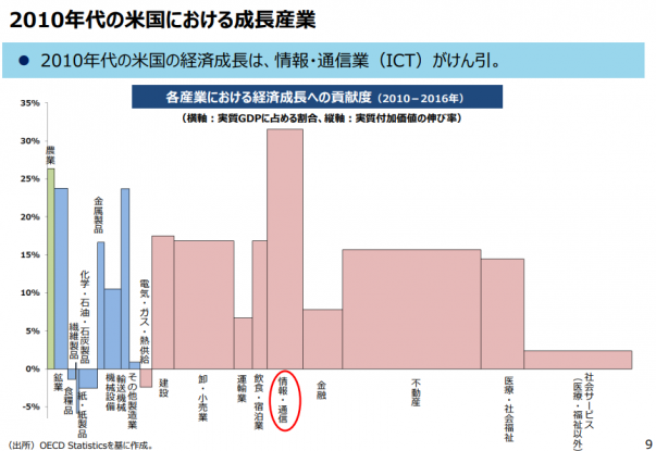 アメリカと日本を比較しよう。アメリカは、2010年代は情報・通信業がけん引した。