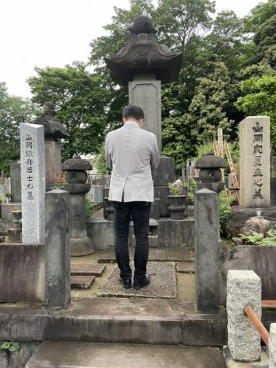 写真)山岡鉄舟の墓で手を合わせる筆者。筆者提供。