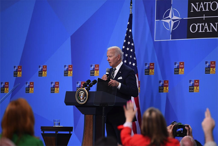 ▲写真 NATO首脳会議でのバイデン氏の記者会見の様子(6月30日) 出典:Photo by Denis Doyle/Getty Images