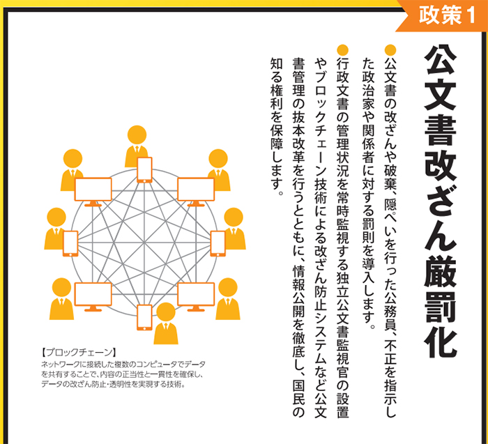 国民民主党と維新の会はともにブロックチェーンについて主張している。維新の会は「公文書の管理・保存については総デジタル化を原則とし、ブロックチェーン技術等の導入により徹底した書き換え・改ざん防止の仕組みを構築します。」と記載、立憲民主党は「請願のデジタル化を含め、国民が行政や立法の意思決定プロセスに直接参加できる「シビックテック」など、デジタル民主主義を推進します。」と明記している。公文書管理、民主主義の統治の仕組み、民主主義を機能させるために必要なところに、デジタル技術も活用するという点に着目しているところはさすがであり、もっと、もっと推進できるはずである。