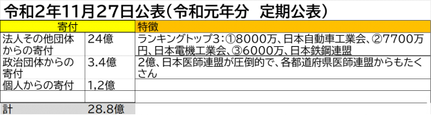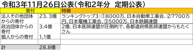 自民党の政治献金の受け皿である国民政治協会の寄付トップは、第1位は2億円を寄付した日本医師会の政治団体「日本医師連盟」、第2位は日本自動車工業会、第3位は日本電機工業会である。