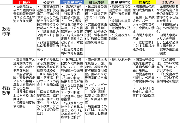 今回、政治改革・行政改革について図にまとめると、各党それなりに良い案を出していると率直に思う。