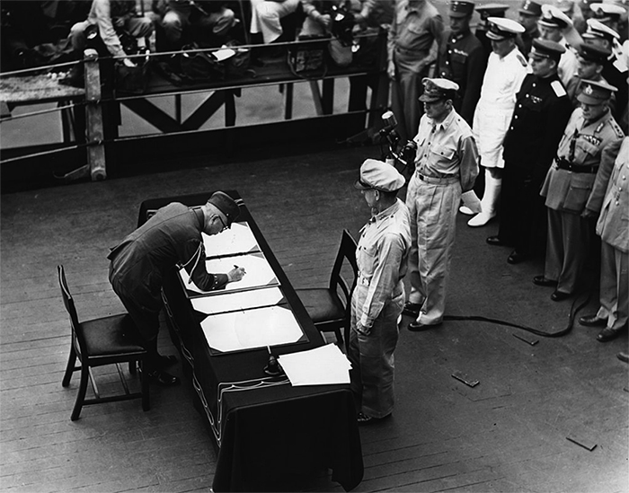 ▲写真 ダグラス・マッカーサーが日本の無条件降伏を受け入れる様子 出典:Photo by Keystone/Hulton Archive/Getty Images