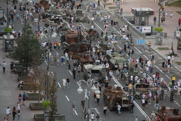 写真)ウクライナのキエフで繁華街に展示されている燃え尽きたロシアの軍用車両を見る市民ら(2022.8.22)