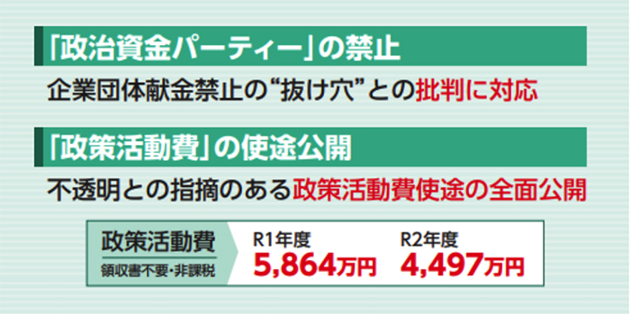 これらの政策の特徴を見てみよう。第一に、政治改革。身を切る改革の徹底と適正化を掲げ、政治家改革に言及するなど本物感にあふれる。「政治資金パーティーの開催や領収書不要の政策活動費を認めるなど徹底さを欠いている」という問題意識のもと、徹底した 「身を切る改革」を断行すると決意。企業団体献金の抜け穴になっている政治資金パーティー禁止、領収書不要の抜け穴である「政策活動費(組織活動費)」の使途公開で政党幹部による政治資金の私物化を防ぐ、「政治資金私物化防止法案」を復活させるなどかなりの先進的な改革を提起している。