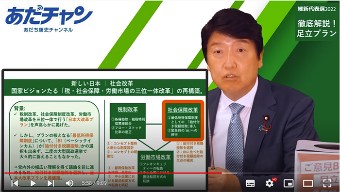 ▲youtubeキャプチャ 出典:【徹底解説!足立プラン⑤】日本維新の会代表選挙 足立康史 公約解説 社会改革
