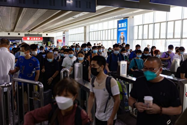 写真)保護マスクを着用して上海駅の待合室にチェックインする人々(2022年7月11日、中国・上海)