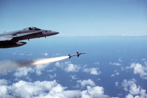 写真) 第 131 攻撃戦闘飛行隊 (VFA-131) F/A-18C ホーネット航空機から発射されたAIM-7 スパローミサイル .1992年12月2日、ルーズベルト ロードの海軍基地付近で。Photo by Commander John Leenhouts, USN.