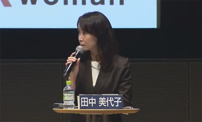 ▲写真 日本コカ・コーラ株式会社広報・渉外&サスティナビリティー推進本部副社長田中美代子氏(2022.09.19) 出典:日経が開催した「ジェンダーギャップ会議次世代につなげる、グローバルで活躍する女性リーダーたち」にてキャプチャー
