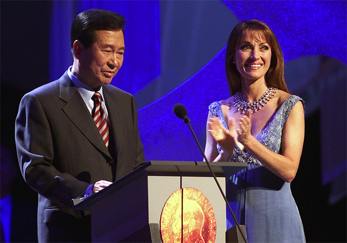 ▲写真 ノーベル平和賞コンサート2000のステージで司会者に迎えられる、同年のノーベル平和賞受賞者、金大中韓国大統領(2000年12月11日 ノルウェー・オスロ) 出典:photo by Gabe Palacio/ImageDirect