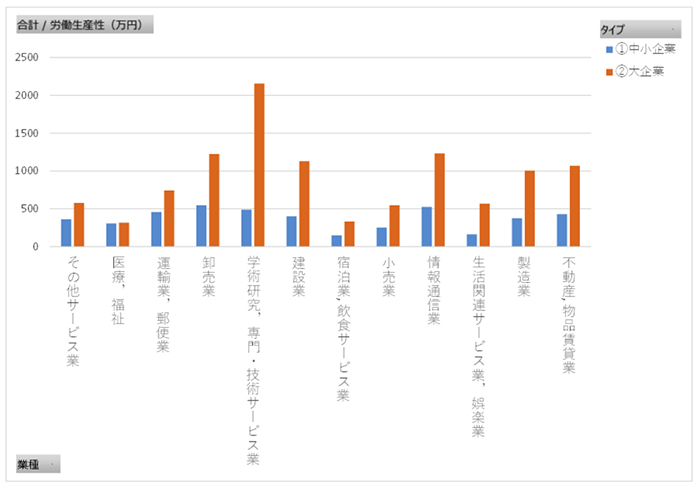 ▲表 【出典】経産省HP「規模別・業種別での労働生産性の比較」より筆者がデータ加工