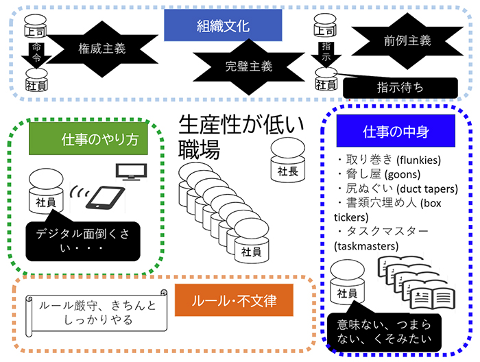 日本の場合は、労働者の能力は高いとされているので、労働生産性が低い理由は、第一に、ビジネスパーソン・従業員・労働者にとって働きにくい職場環境、第二に、仕事のやり方、大きくこの2つに問題があるということだと考えられる。