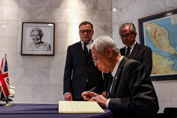 写真)エリザベス2世女王死去を受け、弔意の記帳をするイスマイル・サブリ・ヤーコブ首相(2022年9月15日 クアラルンプール)