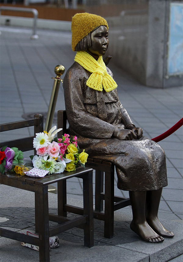 ▲写真 ソウルの日本大使館前に設置された慰安婦を象徴する少女像(2015年 韓国・ソウル) 出典:Photo by Chung Sung-Jun/Getty Images