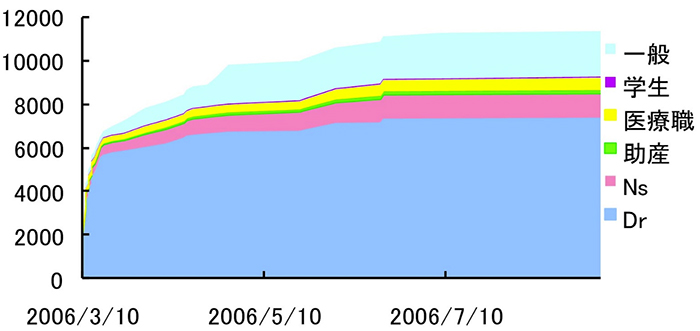 ▲図1 署名の進行状況 松村有子氏(東京大学医科学研究所、当時)作成 ※Drは医師、Nsは看護師、助産は助産師を意味する。