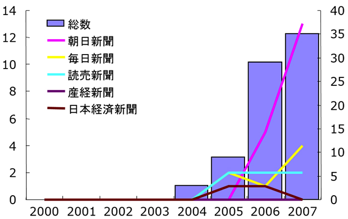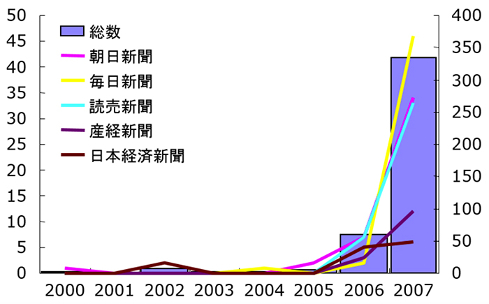 ▲図5 全国紙での「医療崩壊」の記事数。日経テレコンを用い、岸友紀子氏(東京大学医科学研究所、当時)が調査