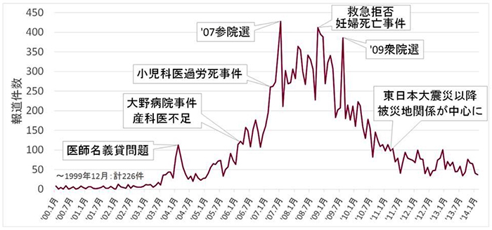 ▲図4 全国紙における「医療崩壊」の記事数。日経テレコンを用い、瀧田盛仁氏(東京大学医科学研究所、当時)が調査