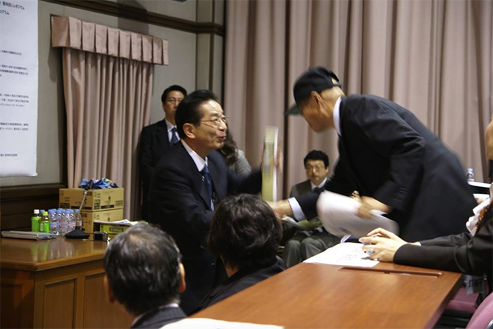 佐藤教授は、仙谷氏への感謝の念を忘れなかった。写真は2009年11月の東大医科研講堂で開催された『現場からの医療改革推進協議会シンポジウム』の模様だ(写真3)。仙谷氏は発起人の一人で毎年参加していた。当時、病気治療中だった佐藤教授は「どんなことがあっても仙谷さんに御礼を言いたい」と参加されたのだった。