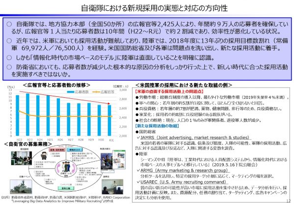 米軍においては、状況を憂慮して、問題点を調査把握して対策を取っている。だが自衛隊の場合そのような取り組みが為されていない。自衛隊のリクルート組織の効率が低いのは当然だ。地方協力本部はリクルートの専門家ではない幹部(将校)が2年単位で入れ替わる。だから専門家としての経験も知見も育たない。このシステムを抜本的に変えるべきだ。