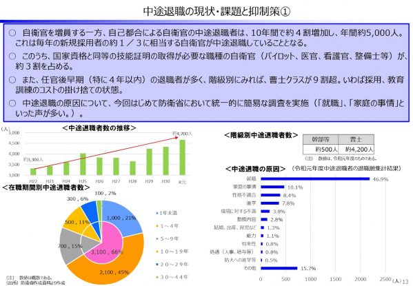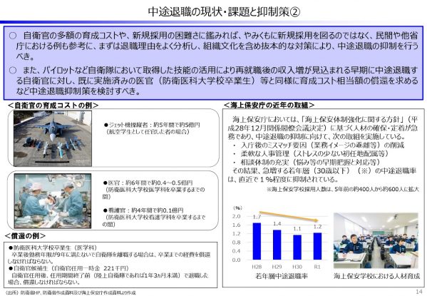 ○ 自衛官の多額の育成コストや、新規採用の困難さに鑑みれば、やみくもに新規採用を図るのではなく、退職原因をよく分析し、組織文化を含めた抜本的な対策を講ずることによる中途退職の抑制を行うべき。