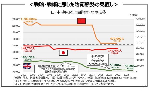 その観点から必要なのは人員削減も含めた合理化である。そもそも自衛隊のように「職業軍人」が原則定年までいる軍隊は奇異である。他国では一定年齢で一定階級に達しない将兵は軍をさらないといけない。だが自衛隊は基本的に定年まで働く隊員が多い。