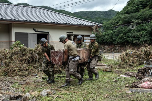 写真)豪雨による球磨川決壊で家屋から物資を引き上げる自衛隊員(2020年7月6日 熊本県球磨村)