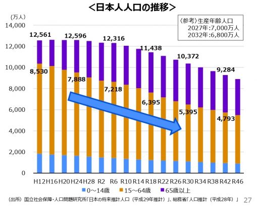 それにはいくつか理由がある。まず我が国が少子高齢化によって、若年層の減少が挙げられる。15歳~64歳の就業可能人口は平成12年が8,530万人だったのに対して、令和6年は7,218万人と、1,300万人減ることになる。更に令和18年には6,395万人、令和30年には5,395万人まで減少すると予測されている。つまり平成12年の四分の三まで減少することになる。(資料1)