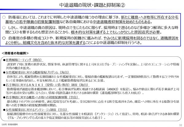 ○ 防衛省においては、これまでに判明した中途退職の幾つかの理由に基づき、新たに離島・へき地等に所在する分屯基地への若手隊員の初度配置制限など各自衛隊における中途退職者抑制策を始めたものもある。