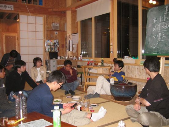 2011年の東日本大震災の時も、相馬市内に合宿所を設けた。管理運営を担った星槎グループにちなみ、「星槎寮」と呼ばれた。ボランティアで現地に入った人々、地元の人々が集い、毎晩のように意見を交換した。写真は2012年7月のある夜の光景だ。この夜は、地元の福島県立相馬高校の高村泰広先生を初めとした3名の先生方がやってきて、地域の復興のためには、教育の底上げがもっとも大切だという話で意気投合した。