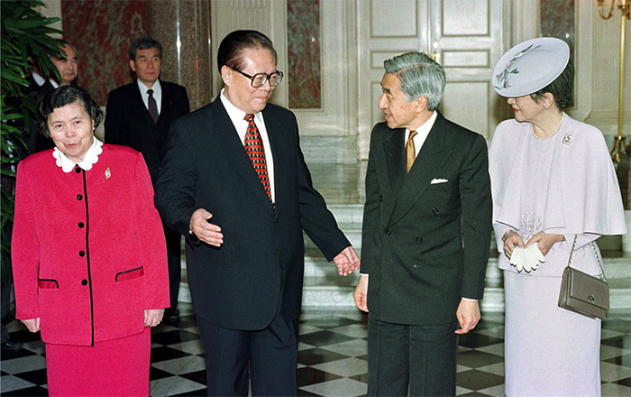 ▲写真:左から江沢民の妻王冶坪と江沢民、明仁天皇とその妻美智子皇后(1998年11月25日 日本・東京) 出典:Photo by noboru hashimoto/Corbis via Getty Images