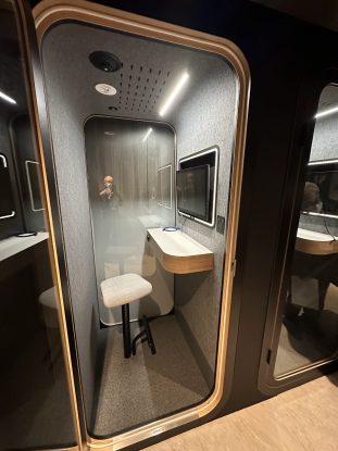 写真:テレワークスペース。壁面に大型モニターが設置されている。