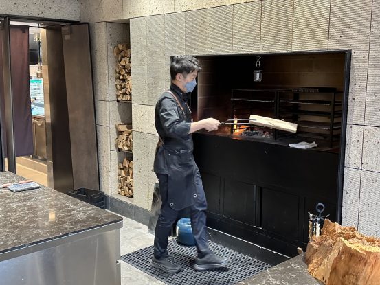 写真:館内のレストラン「炅」。調理のために薪をくべる様子。
