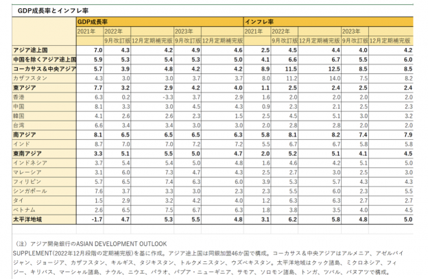 出典)アジア開発銀行 2022年12月段階GDP成長・インフレ予測 資料を基に編集部作成