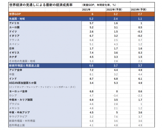 ・IMFは2023年の先進国・地域の経済成長はいずれも下落し、新興市場国と途上国の成長率も大半が落ち込むと予測。