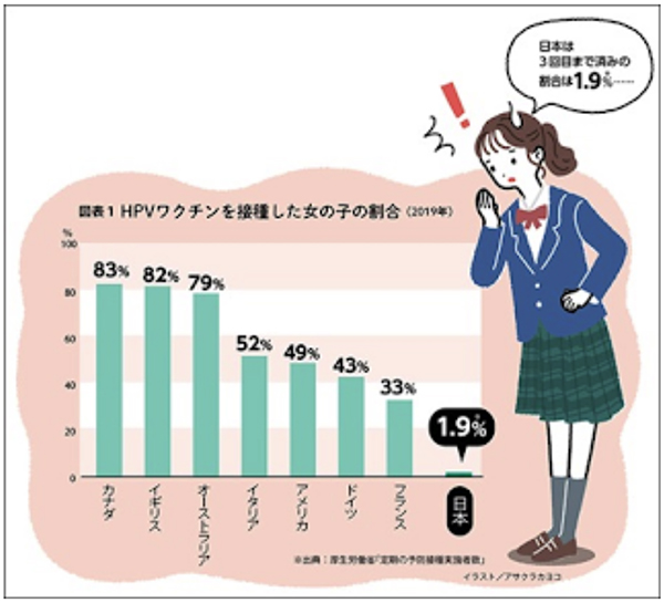 世界的に見ると、HPVワクチンの接種率や検診の受診率は70%を超える国もある。しかし日本ではワクチン接種による副反応を訴える声が相次ぎ、2013年に厚生労働省がHPVワクチンの積極勧奨を中止したという経緯がある。そして現在、日本における接種率は1.9%と他の国に大きく後れを取っている。