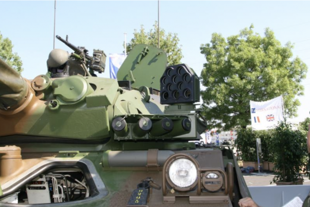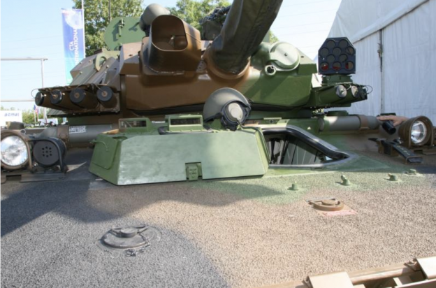 写真:近代化に伴い、砲塔後部に装備されていた4連装発煙弾発射機は砲塔前部に移された。また砲塔左にはEADS社が開発した赤外線ミサイル攪乱装置、EIRELが搭載されている。