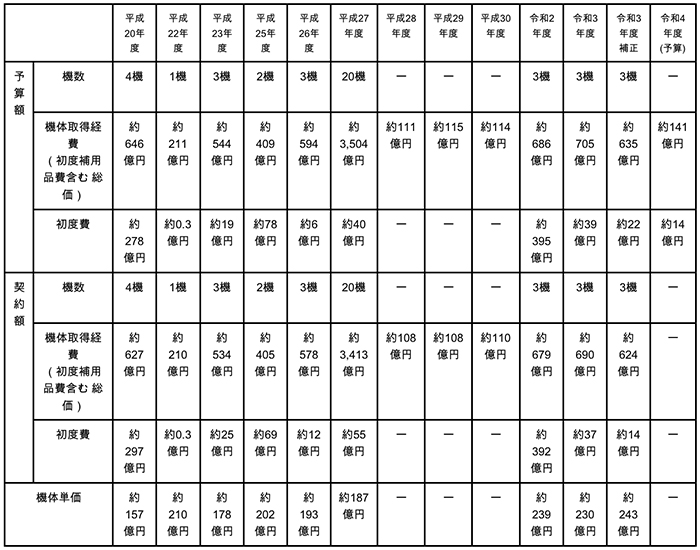 ※1- 平成28年~平成30年度予算額及び契約額は、平成27年度20機の搭載電子機器等の一部を調達、※2- 機体単価は、契約額を記載。ただし、令和3年度補正の機体単価については、令和3年度補正契約額及び令和4年度予算額から算出