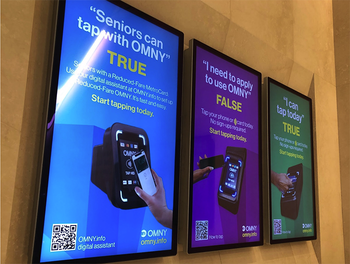 ▲写真 新改札システム「OMNY」の使い方をの特徴を宣伝するディスプレイ(筆者提供)